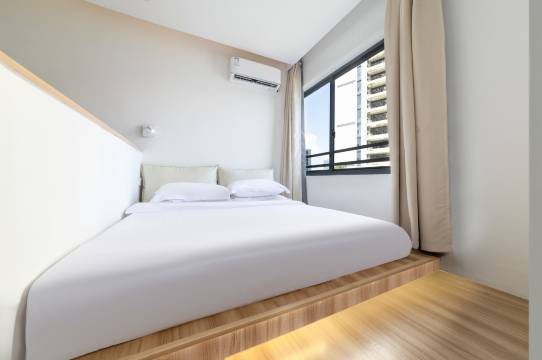 到店时老板主动帮忙免费升级了房间,沟通起来特别亲切。房间里的高清投影仪画质很清晰,晚上躺着看电影超有氛围感;冰箱能放饮品,洗衣机解决了换洗衣物的麻烦,细节满分。整体打扫得很彻底,桌面、床品都没污渍,住得特别安心,推荐!