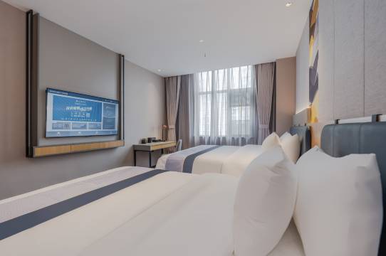 前台服务热情,房间干净,房间有智能小度,比较方便,洗手间是智能马桶,装修温馨,房间还有安睡花茶,很暖心,订的是高级大床房,是一个大的外窗户,晚上还是比较安静的,早餐也不错,忘了拍照[调皮],入住体验极好。强烈推荐给朋友!