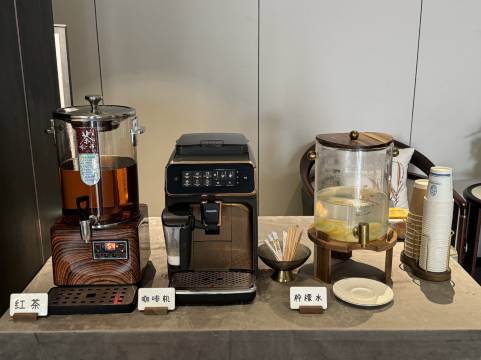 一进大厅就是阵阵桂花香,前台有供住客们自助取用的一次性马桶垫、卸妆湿巾、耳塞、漱口水、儿童盲盒等还有免费的茶、柠檬水和咖啡等,真的是非常贴心!