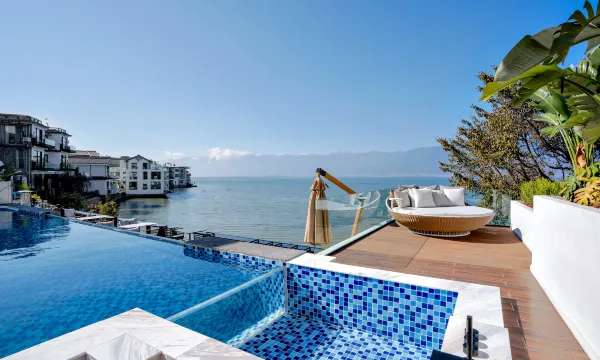 酒店坐落在双廊镇的核心地段,会有人来酒店外不远的停车场来接送行李。一进酒店的院落非常安静,一点也不吵闹,酒店自己就有个海景餐厅,环境很舒适惬意。我们住了两间房,给爸妈订的是庭院大床房,面积很宽敞,有独立庭院和泡池,不过因为在一层不临海看不到海景。因为酒店太舒适了,以至于我们全家第二天都没去景点玩,一直在泡酒店,孩子看电影,爸妈在海边下棋,在院里的大榕树下打牌,感觉真的是打开享受洱海的正确方式!酒店服务也特别好,有求必应,正值孩子过生日,还送了小蛋糕。还有值得一提的是酒店早餐,品种虽然不算多,但很可口,竟然还有小米海参粥!总之,我们全家在春节期间在酒店度过了非常愉快的一段时光,非常感谢!下次再来的话,一定要住两晚😊