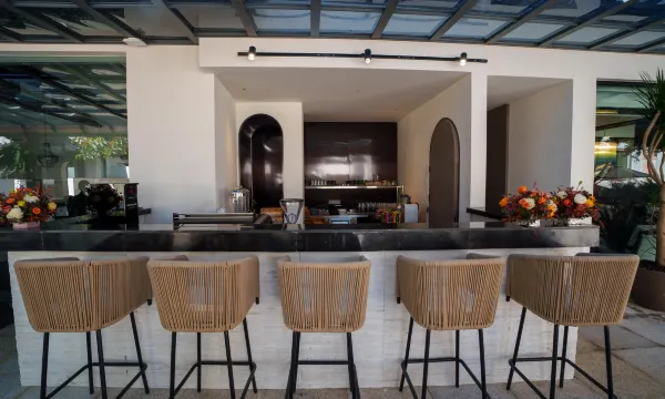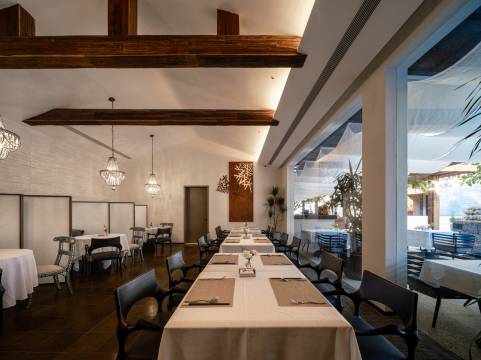 酒店拥有一楼餐厅和户外就餐区域,当山海自然介入餐饮空间,勾勒出流动的餐厅形态。山海、美食、艺术跨越维度建立空间联系,于此坐望山海,感受味蕾与感官的浪漫体验。