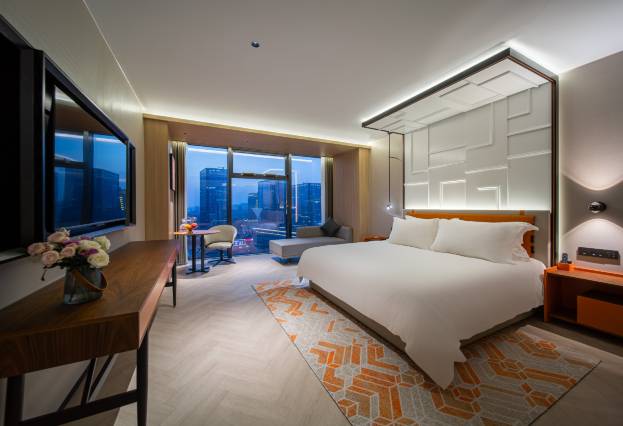 客房浴区以高级大理石铺陈,干湿分离的淋浴空间通透又显大气,精致的洗漱台搭配设计感十足的镜饰,灯光晕染间尽显品质格调;睡眠区域,整洁松软的大床搭配高品质床品,床头艺术感十足的造型与柔和灯光交织,营造出静谧温馨的休憩氛围;窗边休闲角落采光绝佳,精致小桌配舒适座椅,无论是浅尝鲜果、沉浸阅读,还是静享光影流转,都惬意无比。