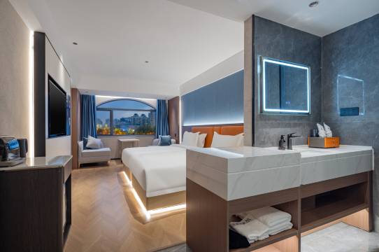 酒店坐落于城市的核心地带,以其独特的建筑风格和卓越的服务品质,成为商务旅行者和休闲游客的理想之选。酒店以“唯美体验,特色服务”为理念,致力于提供宾至如归的温馨感受。酒店拥有各类客房,从宽敞明亮的豪华套房到温馨舒适的标准间,每间客房都经过精心设计,融入了现代简约的时尚感。房间内设施一应俱全,包括高清电视、独立温控系统、高速网络连接等,为客人提供舒适便捷的住宿体验。