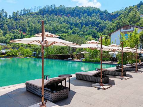 酒店隶属于宜宾三江投资建设集团有限公司,占地约95亩,建筑面积约3.8万平米,主体建筑共计10栋。酒店采用新中式园林设计,定位为高端城市生态度假酒店,由多间/套的高端客房、3栋精致联排别墅和2栋高级私汤贵宾楼共同组成。酒店内设施齐备,拥有1个大型多功能厅、4个小型会议室、2个贵宾会见室、10个精致的餐饮包房等,可同时容纳近800人就餐。酒店同时设有大型无边泳池和室内恒温泳池,露天泡池、桑拿、健身房、棋牌包间、KTV包房、儿童游乐室等。