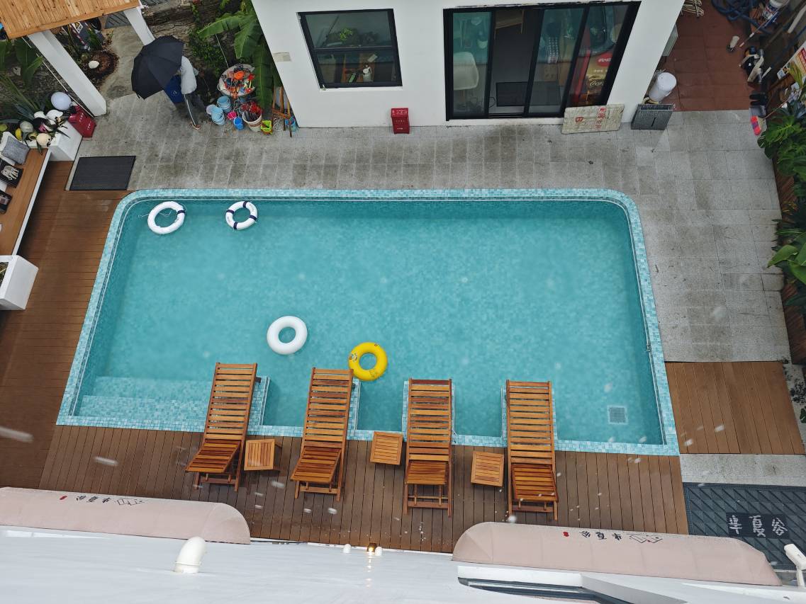 来西岛看玻璃海,住豪华泳池大床房我推荐半夏谷民宿,上下岛有专车接送。酒店卫浴干湿分离,配有超大幕布晚上可以看电影。泳池干净,配躺椅超安逸。二百多的价格性价比拉满,想上岛找老板卖门船票更省钱!