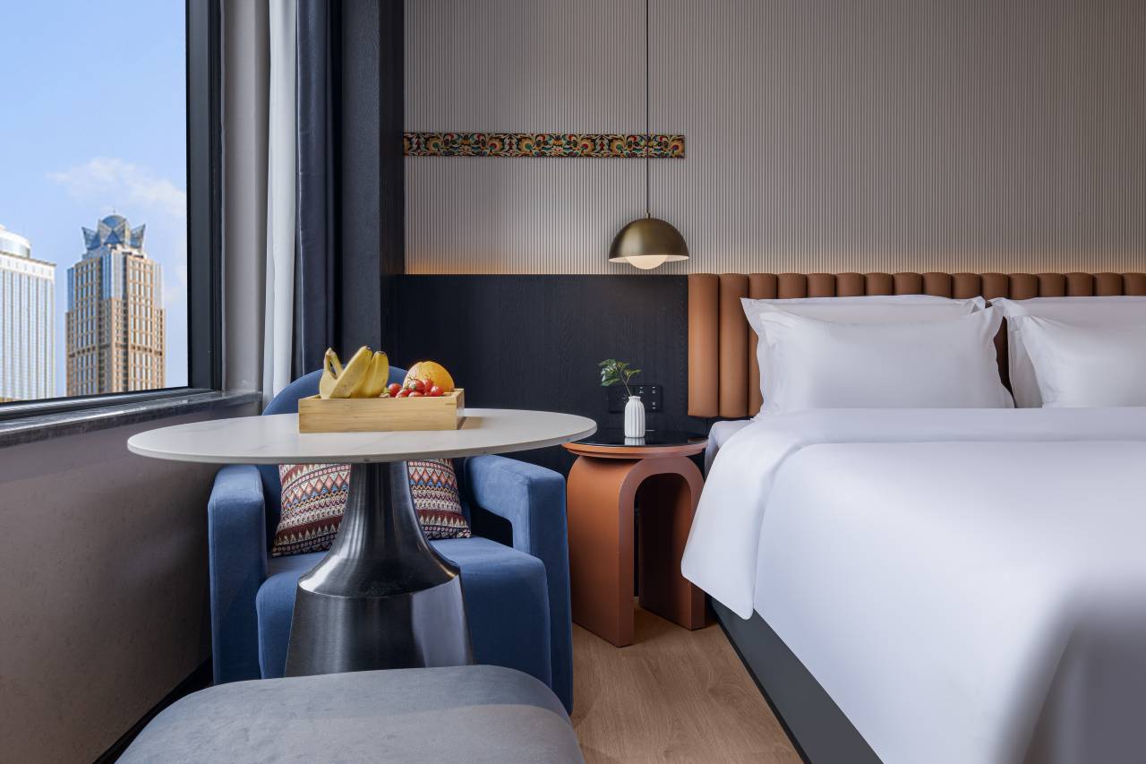 来贵阳旅游的第一晚很不错,离小吃街超级近,出门过个天桥就到了,网红肠旺面就在小吃街门口,前台小姐姐们很热情,还给升级了房型,床很软有两个不同的枕头,乳胶枕睡起来很舒服!房间风格也挺好看的电视机后面还有刺绣的装饰,高楼层视野很好,卫生间放了一次性马桶垫,不过好像没有毛巾,配的是一次性的不知道是大姐忘了放还是就是这样,另外超级推荐荷塘月色豆花烤鱼我的老天太香了!有任何人看见这篇评论不去吃我都会伤心的我跟男朋友一致竖大拇指!贵阳人民你们简直不要太幸福了😍
