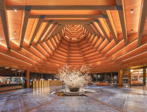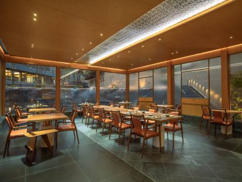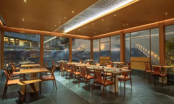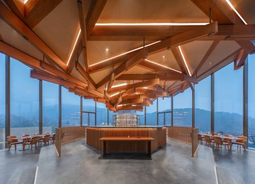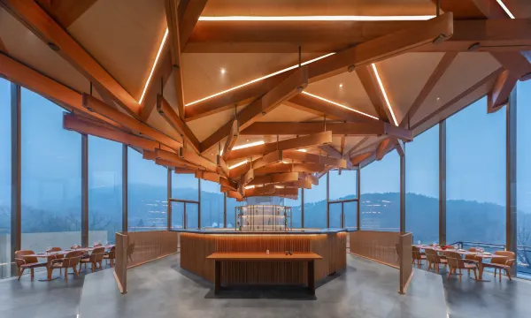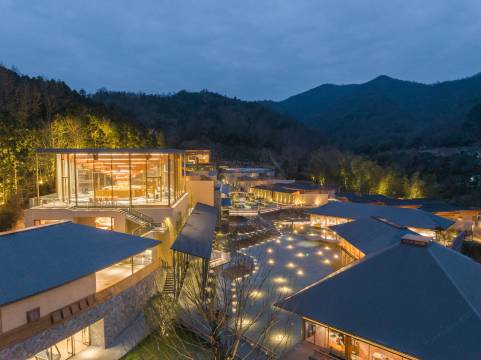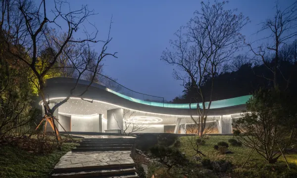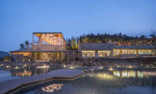 酒店”位于庐江县万山镇,紧邻合肥汤池温泉旅游度假区。酒店依山谷而建,因地制宜。借每一块地形的特征,布置有十个大小不同的园子来跟自然亲密对话。客房,或面山,或面竹,或临水,或隐洞,设计感十足,设计充分发掘了东方禅意美学,并以此创造出极具文化的诗意空间。十个园子,是十种理想栖居的体验。酒店大堂是由北美进口高端木材搭建起,层层抬升、步步向上的星空大堂,其中地面满铺透光混凝土材质为全球首创。夜幕降临,灯光亮起,整个大堂仿佛漫游星际。酒店配套有优质的主厨团队,全日餐厅有包厢可预约;有“上海三联书店”联名的咖啡吧,是具有书香气息的自然之旅;200平方会议室,可满足中型团建和会议需求;酒店高空全景旋木酒吧,藏风聚水。可登高望远,自然的山势起伏,茶园的袅袅仙雾,水声汩汩;位于温泉度假区,除了客房里的私汤,我们也设置了公共泡汤,山岗之间,热气升腾,尽情沐浴自然。山谷间有一月光泳池,悬浮在树梢,溪流从下穿过,畅游其间,仿佛悬空于自然。泳池下是一座瀑布舞台,可瑜伽,可疗愈,可冥想,更是在自然中呼吸空间的最美空间。
