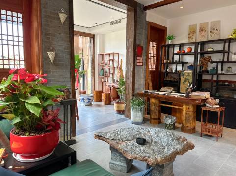 这是一个有温度的清净之地! 这是一个古色古香的院落,门前屋檐下和天井中都流淌着山泉,滋润着周边的梅兰竹菊等花草,也滋润着四面八方的才子墨客。整个院落被古树、亭阁以及一条小河包围,缭绕的烟雾,象白色的轻纱,缠绵着陌色里,轻抚着门前赏风景的人。 走进院中,游龙般鱼儿在天井的清泉里,欢快的穿梭,白净的迎客墙中间,一个巨大的天然灵璧石磨镶嵌在墙上,旁边则挂着几把折扇,看了有种莫名的亲切感,彷佛江南的风吹过北方的村庄。整体感受起来,也像小时候我们看到粮食放进石磨里,磨一磨,就更容易煮熟了,预示我们的陌生的客人,来这里磨一磨,就变得熟悉了。 陌色里是一间民宿,也是一个让心灵休息的地方,这里整体装修风雅别致,充满着浓浓的艺术气息,很多具有欣赏价值的工艺品无所不在,其中具代表特色的当属天下无双的安徽灵璧石,灵璧一石天下奇,声如青铜,色碧玉; 这里有酒、有菜,有接地气的烟火;这里有诗、有画,有接人气的书香;这里有传说、有故事,有接仙气的高人传奇。 这里灵气充沛,适合寻找灵感创作,也适合修练成仙。这里温情似水,适合生活,也适合隐居。这里才色纵横,合适舞文弄墨,也适合谈情说爱。 来吧!走出自己的心间,走出自己的地域, 路过,陌色里。 留下,一幅画,一首诗,一个偶遇,一段故事!