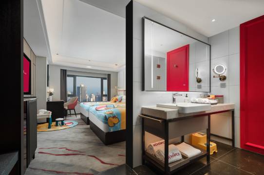 🔴整体房间设计用品牌主题色红色作为亮点,显示出活力气息,电动窗帘,智能客控等配置一应俱全。酒店一面对小区,一面临马路,也因为楼下地铁施工,临小区一侧更安静一些。