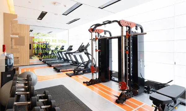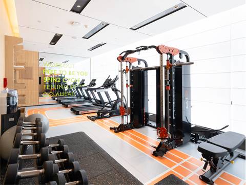 再来说说健身房,完全不是那种随便摆两台机器凑数的“样板间”。器材都是国际大牌,跑步机、椭圆机、力量训练区一应俱全,而且维护得特别好,没有那种陈旧的磨损感。最戳中我的是落地窗设计,清晨一边做瑜伽一边看城市苏醒,或者晚上一边举铁一边俯瞰夜景,运动都变成了一种享受。更贴心的是,健身房还提供免费的蛋白粉、耳塞,甚至还有一次性浴巾,完全不用自己大包小包地带装备。