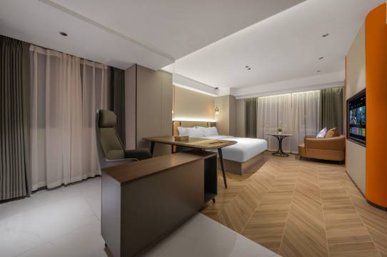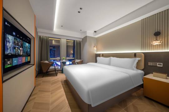 到店比较晚,办理入住和离店超级快,前台小妹妹还给免费升级了城景大床房,免费加矿泉水,这么热的天有冰箱很爽。全屋智能,干净卫生,安静,休息的很好,就在商业区中间,吃喝玩乐方便,之前做攻略说电梯难等,我觉得还好,可能我们出行不在高峰时段,行程匆忙只住了一晚,下次来还会住这里。