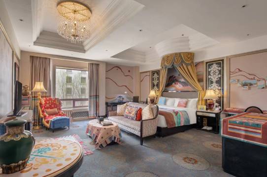 拉萨的洲际是海拔最高的洲际,酒店藏式风情拉满,从大堂的唐卡、藏式木雕到房间的吉祥八宝纹样,处处都是地道细节。