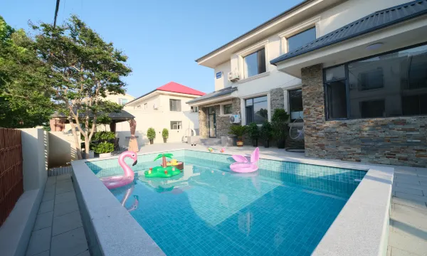 平米数足足有300平大院子也非常好,小姐姐还给新放了水清洁了泳池去。的那天赶上下雨了,没有享受到泳池小姐姐还非常贴心地说怕我们着凉。允许带宠物入内,室内也可以烧烤,非常不错的亲子之选,划算又推荐