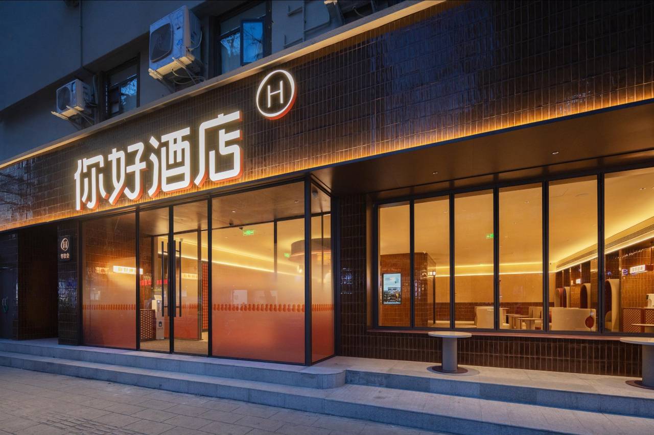 你好酒店 是华住集团旗下⾯向国⺠市场、更聚焦于新⼀代主流消费群体的国⺠酒店品牌。品牌创⽴于2019年,截⾄⽬前全国⻔店数量已达300+家,店以「中国传统元素的当代表现」为设计理念,空间设计中应⽤了诸多标志性的中国元素,如:由琉璃砖⽡与桔梗环保材料铺设的公共空间;运⽤在各处可⻅——寓意着福禄欢喜的「葫芦」、数字符号的「8」,以及客房中「⻰型图腾」、「纸鸢」等中国元素。