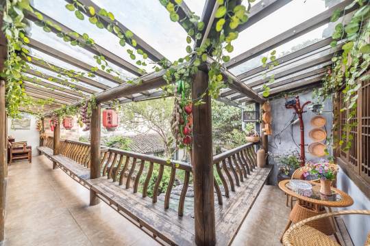 客栈为典型徽派建筑,双层楼阁,雕花门厅,木质回廊,古朴精致。私家庭院静谧隽雅,远观群山苍翠,近闻鸟语花香。