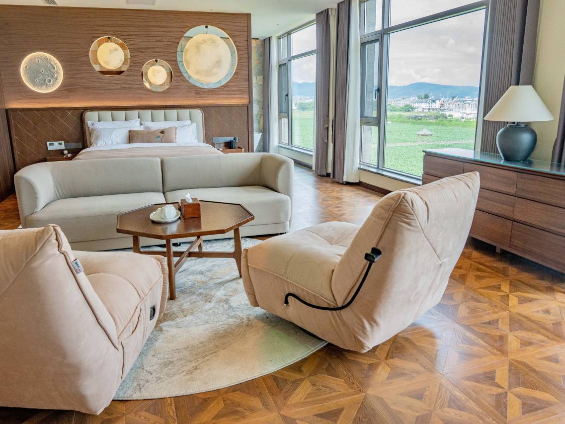 民宿在一个叫马房村的村里面,距离抚仙湖马房村湿地公园走路约十来二十分钟。整个村子的装修氛围很棒,花花草草美不胜收,一路拍着美照,悠哉悠哉。民宿是新开的,可以看出老板对装修花了心思,每个角落,每个摆设都尽显品味。我们去时,客人少,前台漂亮的小姐姐带我们去看房间,选择自己喜欢的。有电梯,大件行李可以轻松上楼。房间干净舒适,坐在芝华士沙发上从大大的玻璃窗看向外面的田园风光,别提多惬意了。早餐更是惊喜,现场竟然有古筝演奏,早上云南初秋的阳光,美味的米粉,优雅的琴声,为我们的自驾游留下了美好的回忆。