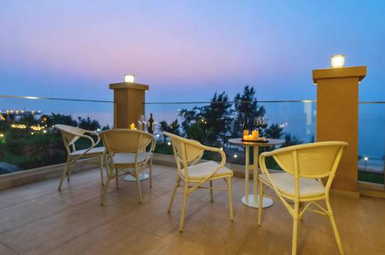 这里风景绝美!正对大海!这边是别墅区,沙滩人不多,日落时分好美!酒店服务很好,有漂亮的早餐和下午茶,草坪和大海很有度假感觉。房间露台很大,还有私人泡池!