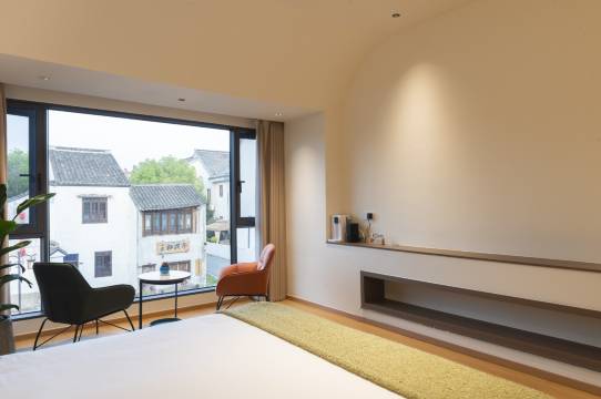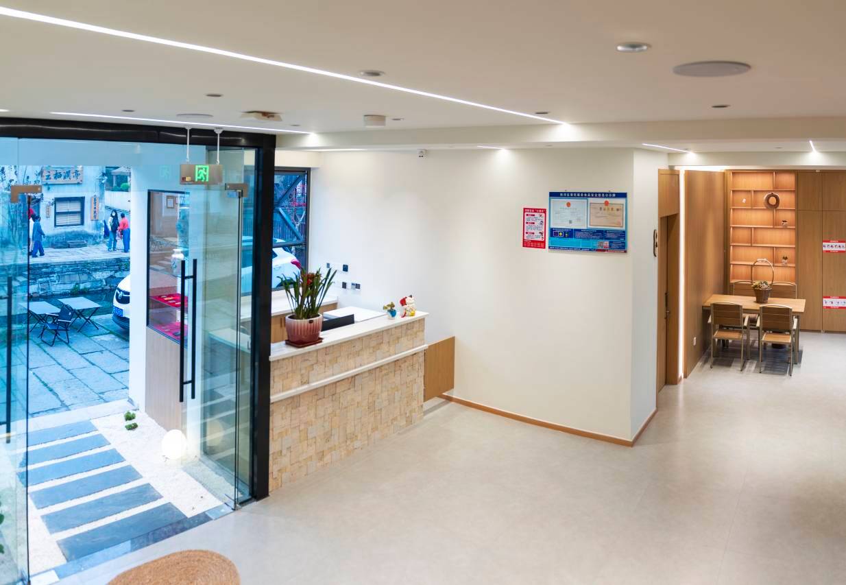 在古镇南门这,交通方便,停车也方便.老板非常热情,回家感觉。房间全地暖,干净舒服,热水足,枕头很好帮助睡眠,比泰国的好。落地窗明亮,窗外就是古镇小河。一个愉快的周末。