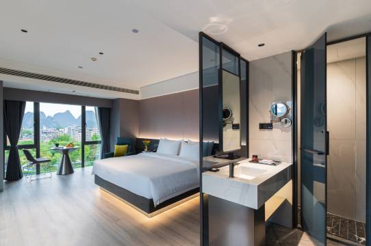 来桂林前朋友推荐她住过这家,到了桂林,朋友还是建议住他家,万象城楼下停车位多,而且酒店楼下电梯也很容易找到,到前台办理入住手续,前台帅小伙特别热情,应为我们第二天要赶路,提出是否能升级两间房含早,他跟领导申请得到批复后,亲自带我们到房间介绍房间设施,房间宽大舒适明亮、窗外望去看见山景非常美丽,房间床品干净卫生舒适,早餐特别丰富,特别是桂林米粉,吃了一碗没过瘾,再来一碗。下次来桂林还是选择这家。