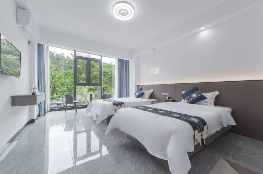 民宿以其独特的品牌标志和蓝色的醒目标识,在众多住宿选择中脱颖而出。 民宿外观设计现代简约,两栋建筑矗立于绿树环绕之中,窗户明亮,透出家的温馨与邀请。走进民宿,您将被其内部精致的装修和贴心的布局所吸引。每个房间都经过精心设计,既保留了传统民宿的温馨氛围,又融入了现代生活的便捷与舒适。房间内设施一应俱全,让您在旅途中也能享受到家的便利与温馨。