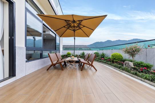 阳台漂亮的小花园里吹着风看远处的青城山,惬意~