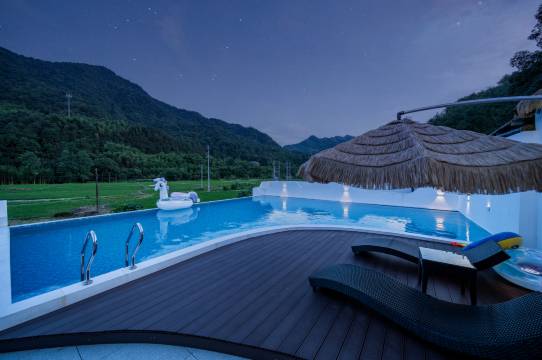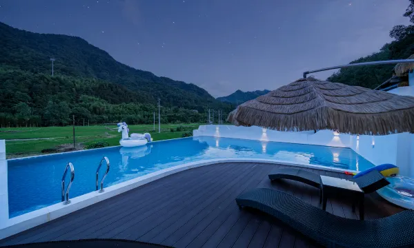 本店地址:桐庐瑶琳镇桃源村蒋家二组金逸五金厂西南。 (导航搜索:桐庐瑶琳镇H²O青曼) 面积:别墅内3层600㎡+户外面积1200㎡(别墅侧后方泳池,棋牌室,台球厅),共1800㎡。 别墅户型:欧式风格客厅+15人餐厅+开放式厨房+麻将房+12间独立卫浴客房+花园庭院+滑梯+秋千+泳池+天幕+免费停车位10个 设施:提供12间客房、1台自动麻将机、复古游戏机、各类棋牌桌游、台球桌、室外投影(K歌最晚时间晚上九点,电影电视时间随意)自助厨房、烧烤场地、免费停车位等。 容纳人数:场地活动50人,住宿40人左右 配套服务:餐饮酒水零食、场地布置、团建活动、私人定制、私人管家等 民宿位于瑶琳仙境附近,吡邻坞口水库。右边靠稻田,正面就是进酒店的路口。前面靠进·公路,交通方便,有免费停车位。院内有秋千,滑滑梯,超大的游泳池。不同的房型,不同的分格,给人有一种干净.明亮的感觉,一楼为娱乐区,有自动麻将机,台球桌,游戏机。民宿附近有瑶琳仙境,垂云通天河,OMG心跳乐园,桐庐马术中心,瑶琳国家森林公园,天目溪漂流,红石湾景区等等。