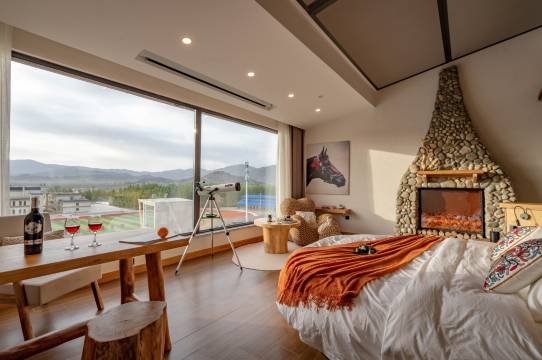 【原生自然,哈萨克风情】民宿以“原生、自然、舒适”为设计理念,巧妙汲取了当地哈萨克民居的灵感。步入民宿,你将被独特的民俗手工艺品所吸引,马具制作工艺和原始毛皮雪板诉说着古老的故事;天然材料实木、鹅卵石、稻草泥构建的墙面,散发着质朴的气息;本地的乡间油画作品,更是为这里增添了一抹艺术的色彩。在这里,你仿佛置身于大自然的怀抱,与自然环境和谐共存。【科技与自然的完美融合】民宿的设计和装修由专业团队操刀,室内以中性色调为主,艺术漆和稻草泥墙面带有着原生态的肌理和质感。角落引入自然光线,绿植映衬下,纯粹朴拙的气息扑面而来。而在这里,你不仅能感受到自然的魅力,还能体验到科技的便捷。宽敞舒适的床铺、零压床垫、智能化马桶和直饮水设备、智能控制系统,让你在享受自然的同时,也能感受到现代生活的舒适与便利。【房型多样,满足你的所有幻想】**风景观房、loft亲子房、观星房……这里的房型风格多样,总有一款能打动你的心。特别是观星房,透过落地窗,你可以仰望璀璨的星空,感受宇宙的浩瀚与神秘。而loft亲子房,则是家庭出游选择,让你和孩子共享温馨时光。【守护野生动物,践行绿色旅行】我们深知保护野生动物和生态环境的重要性,因此在每层走道都展示了当地野生动物的介绍,旨在提高游客的环保意识。通过减少碳排放、守护野生动物的家园,我们致力于打造一个绿色、可持续的旅行环境。