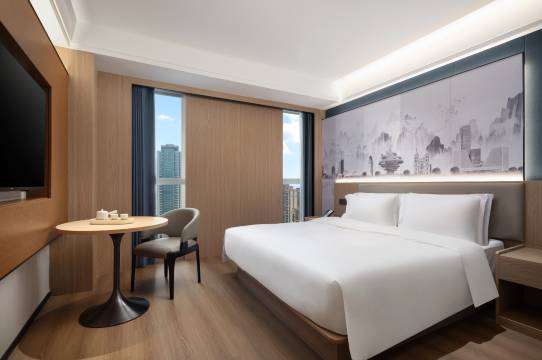 房间很满意,酒店位置离地铁站、公交站还有商场都很近,出行、购物、吃饭啥的都很方便。而且酒店设施总体都很让人感觉满意,房间也干净,点外卖也有机器人能给送过来。前台Nora服务态度很好,主动给升级了房间。很适合出差旅行或家庭入住,下次有机会还会过来!!
