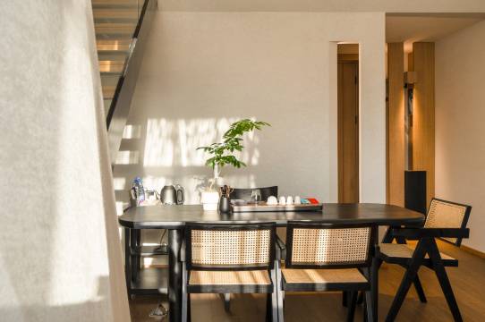 喜欢这里充满呼吸感的空间,每一处转角都有光影的游戏。白色的墙壁,原木的家具,和窗外大片大片的绿意构成了最治愈的画面。