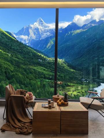 酒店的设计风格现代而典雅,大堂的落地窗和艺术装饰让人眼前一亮。房间宽敞明亮,落地窗让雪山美景一览无余。床品柔软舒适,甚至还有贴心的水温调节,细节满分!
