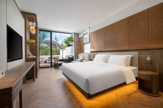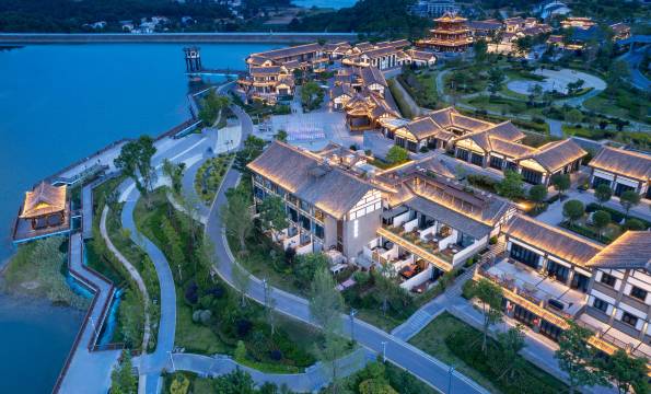 酒店在景区里湖边上,酒店提前联系我们有摆渡车在停车场接到酒店。入住时候前台小姐姐贴心的给我们证件装了保护套。房间在湖边,落地窗看出去风景很好。入住的时候已经放好了水果在房间里,房间很干净。酒店的自行车可以在湖边骑行。下午时候可以在房顶围炉煮茶,晚上的时候在房顶看到整个的街区灯光静谧璀璨。第二天的早餐品类精致丰富,量不够的还可以添加。走的时候还送了特产伴手礼。下次还会再来