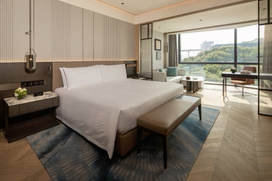 房间宽敞明亮舒适,钢铁与皮革的结合很有简约现代美感,窗外就是绿树成荫,还有卢浦大桥美丽的弧线,夜晚亮灯就是美丽的彩虹桥;