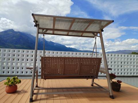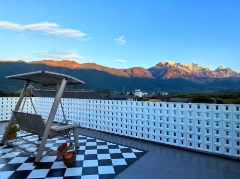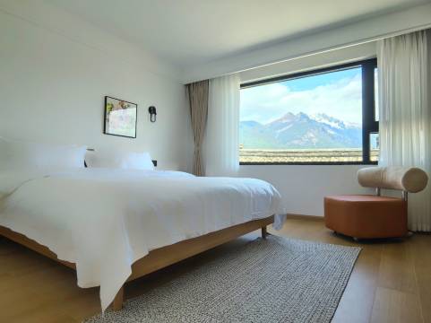雪山观景类房型,在房间内即可眺望玉龙雪山,遇合适天气还可直接在房间观【日照金山】。 民宿一楼院子设计有开阔草地和流水景观池,二楼设有观景平台,三楼设有观景露台。朝可观日出,日照金山,暮可赏晚霞落日,晚可眺银河星海。欢迎大家带小朋友,宠物和亲朋好友一起入住。