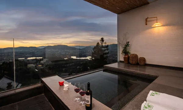 酒店给免费升级房间,从1楼转到了4楼的房间。酒店服务非常好,有提供免费的洗烘干衣服。刚入住时就加了酒店的微信,有任何问题沟通非常方便。日落时分站在5楼的天台上看远山晚霞和城市微光。酒店附近就有泉眼,温泉是入户温泉,很难得,泡过之后皮肤滑滑的很舒服。边泡汤喝茶看风景,很值了。