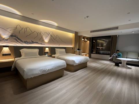 这家酒店是新开的,去住过很多酒店,唯独这家山水源酒店让我感觉真的住得很舒适,房间都是落地窗,外面城市风景特别美,前台服务态度非常好,个个都是年轻有活力的小姐姐,酒店交通方便,还有大型停车场,酒店旁边200米就有美食街,餐厅,夜宵摊,早上他们酒店还有丰富的早餐[强][强][强]