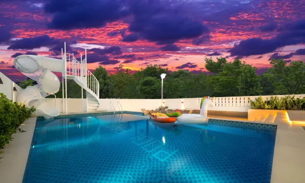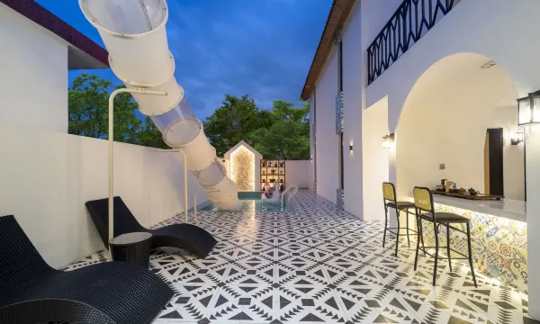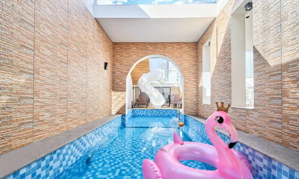 院子里是大大的泳池,从二楼室外那里可以滑梯直达泳池也太棒了🛝