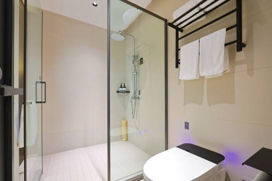 淋浴房宽阔,热水足够,比较特别的是分隔淋浴房和睡床的玻璃,湿水后会有特别效果,希望店方跟进,
