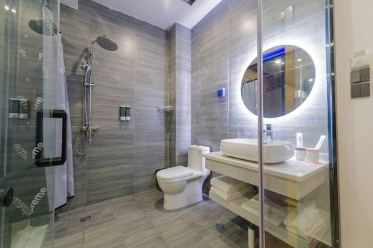 新开业的酒店,各方面设施都非常新,房间宽敞干净整洁,卫生打扫的也非常干净,地理位置好,临近万达广场,买东西吃饭也很方便。特别是前台服务热情礼貌周到,而且还能携程开发票很方便。总之很满意!