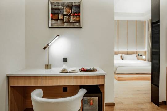 入住酒店非常满意!前台小姐姐温柔耐心,房间温馨整洁,大床柔软舒适,床品干净清爽。衣柜设计实用,浴袍和衣架都很贴心。浴室更是惊喜,智能马桶和毛巾加热架超方便,淋浴间干湿分离设计合理。整体黑白简约风格显得高级又干净。细节也很到位,比如床头的小绿植和沙发靠枕,让房间更有家的感觉。酒店位置便利,服务周到,性价比很高,下次还会选择这里!