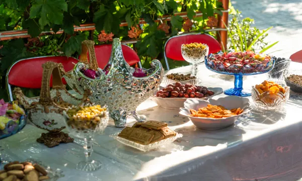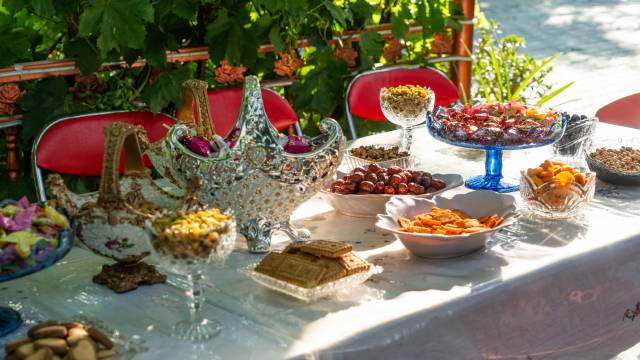 小院在最喀赞其的街巷里 随便走走都是伊犁蓝 院里的葡萄爬满了架子 还有秋千 在上面晃晃悠悠等早饭的时候美得很 本来订的马尔格兰 进屋发现屋里水压有问题 房东果断给换了另外一间 房间没有纱窗 尽量避免长时间开窗户 不然就会有🪰光顾了 我们住的时候非常不巧的赶上了第二天早上停水 据说是水管爆了 整条街巷都被影响 房东兄弟俩很积极地解决问题 也让我们如期吃上了早饭 早饭里的两种果酱特别好吃 一个是樱桃酱 一个是杏子酱 其他食物倒没有特别惊艳 因为停水 馕是外面买来的 也许自家做的会更好一些吧 总之还是推荐的