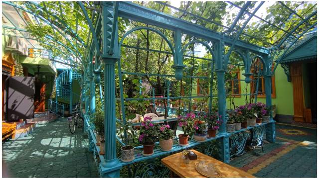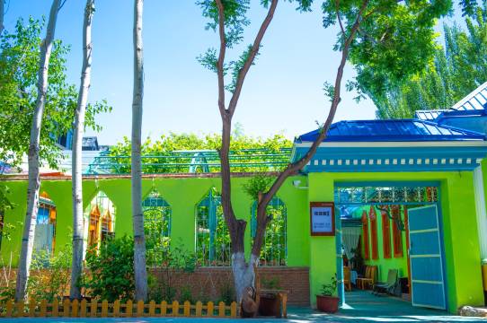 这是一家本地人开的民宿,整体设计很“新疆”,院子顶上全是葡萄藤,还接了好多好多葡萄。整体颜色是蓝色和绿色,很多旅拍的还在院子门口拍照。