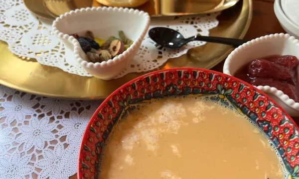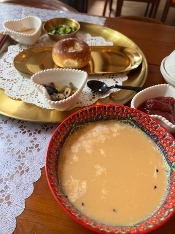 早上的早饭特别好,新疆的咸味奶茶我本来喝不了,但是这家只有淡淡的咸味,更多的是奶香 。配了列巴, 加上自制的果酱和炼乳,又觉得列巴好吃了。