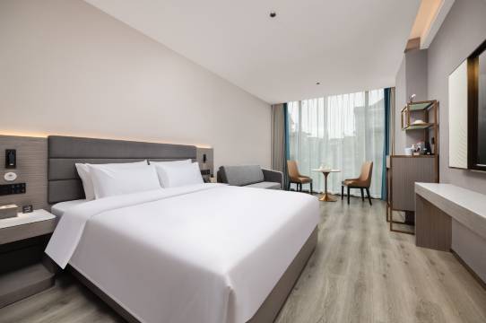 虽然在市区,但房间隔音好,不吵杂,适合休息,房间有落地窗,视野开阔,能看到城市夜景。房间非常干净,床单被套无异味,卫生间干湿分离,没有死角。床垫软硬适中,枕头舒服,睡得很香,房间隔音做得很好,听不到走廊的声音。