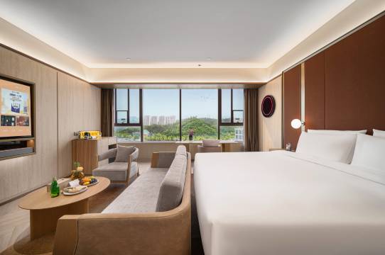 酒店靠近万达广场,交通便利,门前环境不错,有一片树林,房间干净卫生整洁,很喜欢窗户外边晚上的夜景,屋里的两个椅子特别好,喝着酒看着窗外感觉特别好