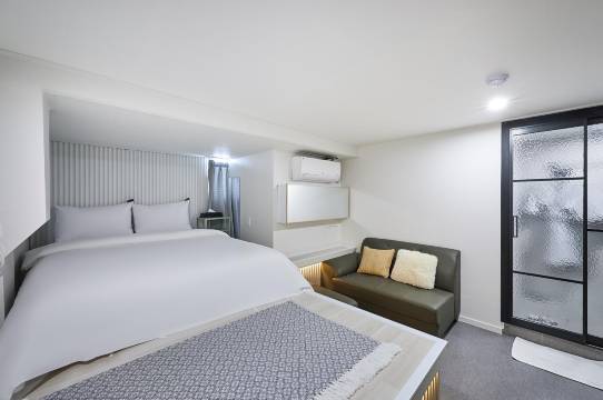 白天有个中国人,也很好。位置很好就在Apm对面,下面也很热闹。门口很小,但是房间真的挺大的,卫生间也现代化,在首尔这个价格这个位置真的很好。楼下还有咖啡,果茶。房间居然也送了饮料。有日常护理包,居然还有避孕套!真心推荐。