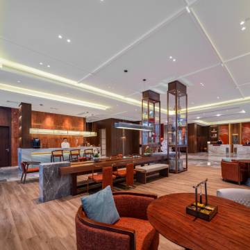 前台服务非常周到,免费升级了房间,鸿运茶味道超级香,淡淡的荔枝味,很好喝,房间宽敞干净,风格也是我喜欢的,客房服务也很及时,出差入住这家酒店真是不错的选择!