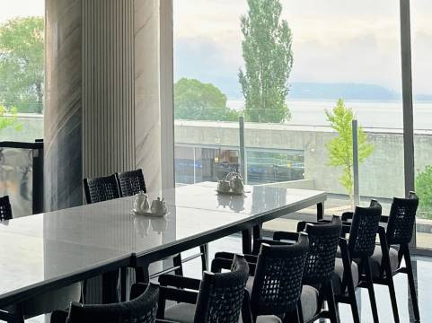 躺在床上看湖景、落地窗如画框。