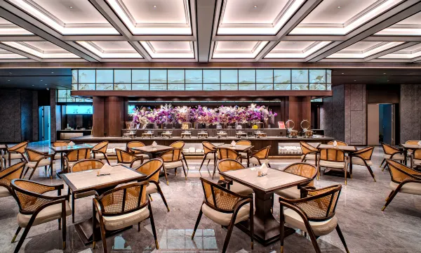 一楼的早餐厅比较大,除了特色中西餐品,也有信阳热干面、胡辣汤、豫竹肉丸汤面等当地特色食品。