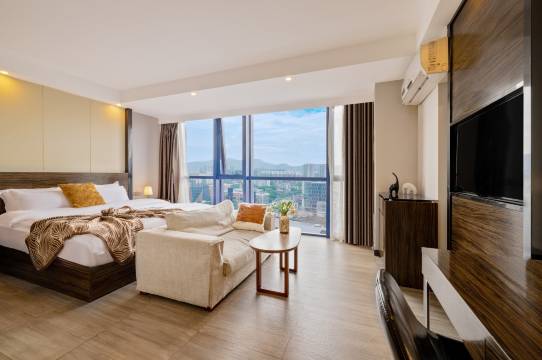 房间装修温馨,家施齐全有家的感觉,这次带孩子入住也没有闹,空间够大住着舒服,卫生干净,落地窗的原因吧采光效果也比较不错不会沉闷,投影有会员清晰度ok,毕竟不是电影院反正比电视好用,不好的就是只有两张椅子,我们一家人还得叫客服补上来,楼下电梯可以直接通向地铁口,现在广州老是下雨不用走外面也是很方便,有机会来广州还会选择。