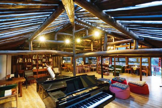 曼山居保留了石头古屋的斑驳石墙,老木梁,椽子,经精心打磨修葺,岁月的肌理依旧清晰可见。讲究空间的留足,两大3000平米的院落一改寻常庭院曲径通幽,而是顺畅通透直白大气,私人泳池、户外睡趴、下沉式篝火烧烤、中西餐厅,美国应小姐音乐书屋、瑜伽路演中心,盐排浴,从500公里外上海运来的三角钢琴,妙曼的钢琴声在深山里的石头屋里响起,让曼山居独具灵气。